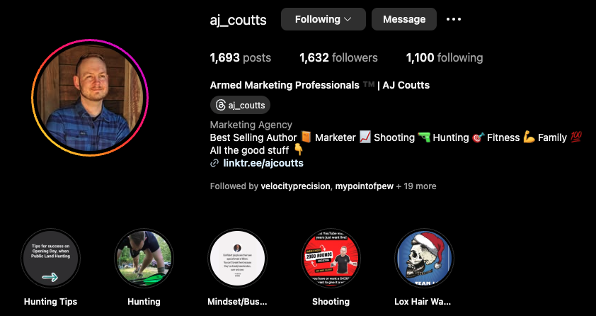 Instagram doesn’t like direct firearm sales, but it does love a good brand story. We set up profiles with only a LinkTree in the bio, so your audience can find everything they need—your website, giveaway pages, or featured partnerships. Story Highlights are critical here. These act as your storefront, showcasing your products, events, or brand values in a way that followers can revisit at any time.